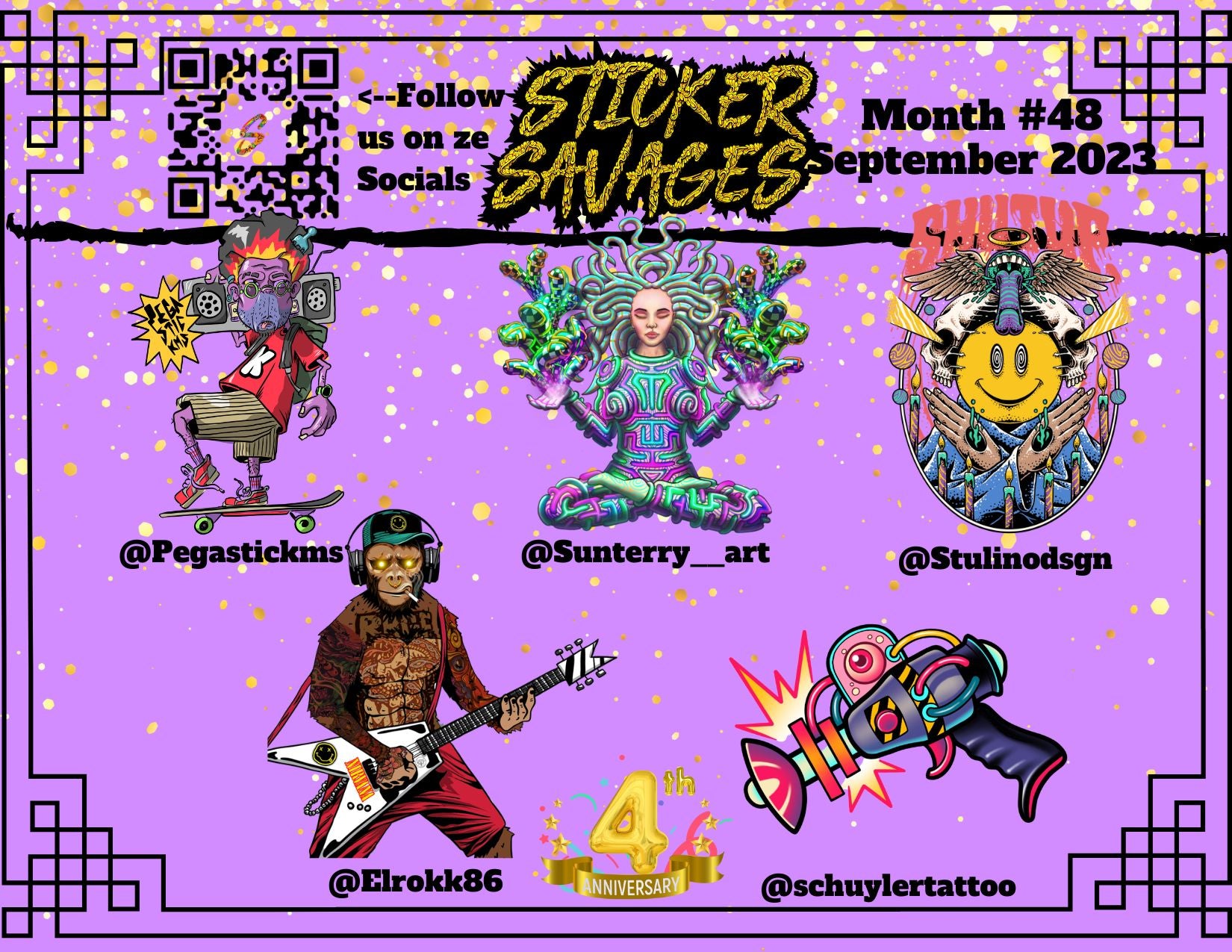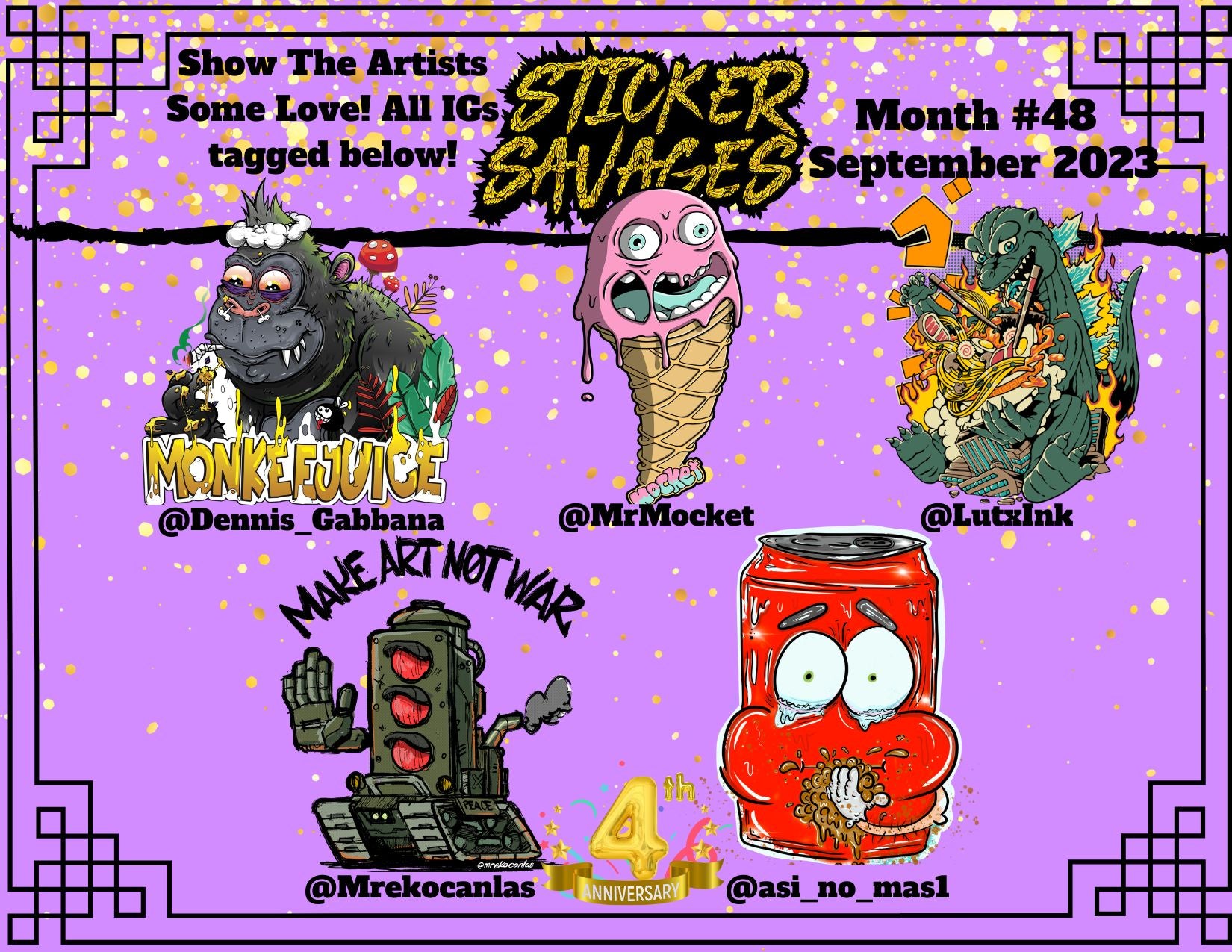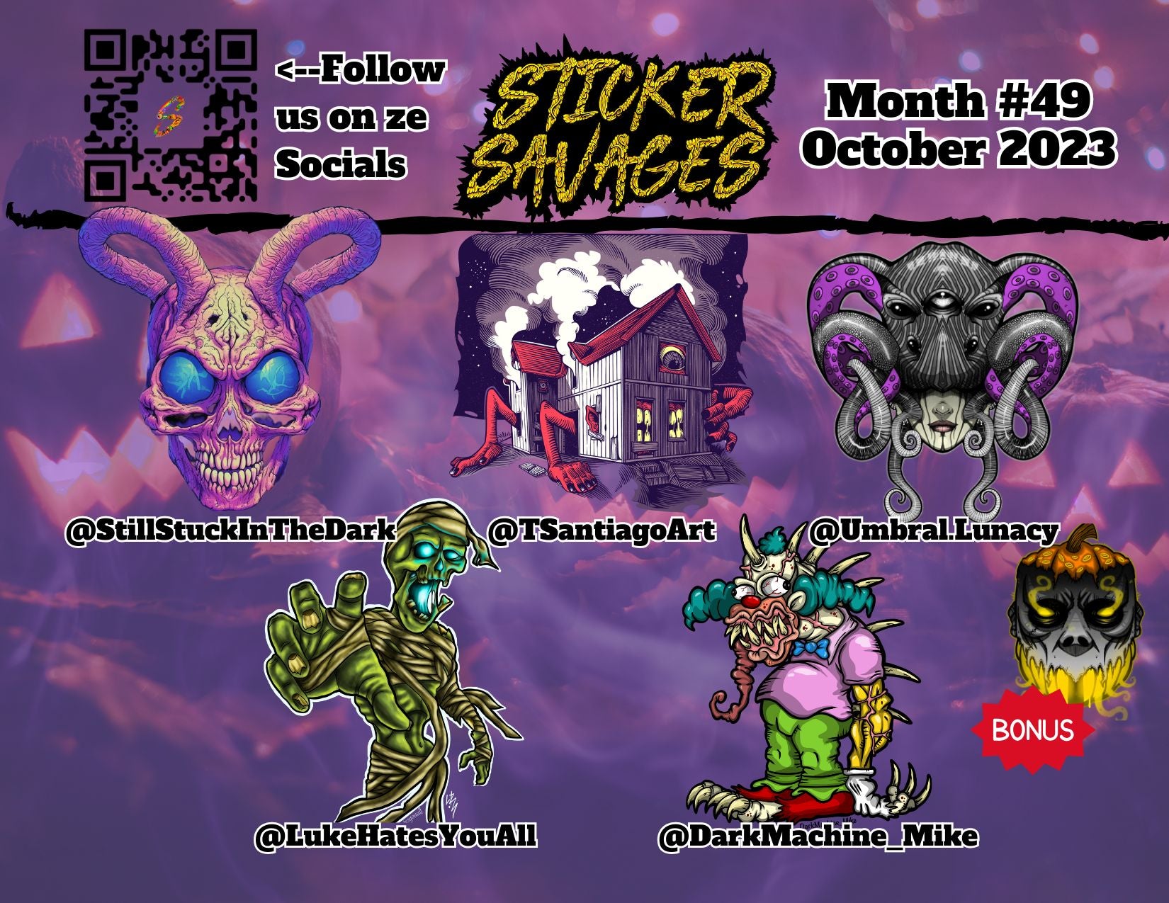 cyclops ball cyborg, spray can triangle man and a awesome king skeleton sticker in August.